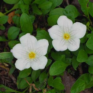 お寺の空き地にポツポツと地面に張り付くように白い2.3センチの花が咲いていました。まわりにある小さな葉がこの花の葉なのでしょうか。