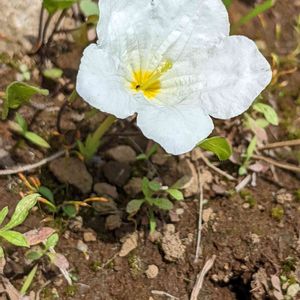 地面から5㌢ほどの細い茎に白い花が咲いています 五枚の花びらがとても可愛いです