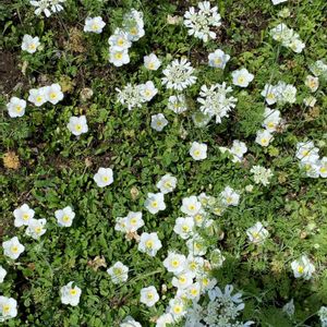 背の低いギンパイソウに合わせて,零れ種からのオルレアが同じ背丈で咲いています😊