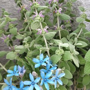 バロータ(シソ科)+ 斑入り野葡萄 (ブドウ科)です ♫ *バロータ 品種不明🫡🏡とにかく 枯らしてました‥挿し穂で冬越し出来て🙆♀️🎶庭植えしてます♪木質化 避けるためにも 剪定✂大事ですね📝 🦋も 遊びに来てましたぁ〰😙♪ 薄紫色の花💠付けてます~目立たないお花❦シルバーリーフとしても 活躍してくれます🧚♂🎶 花言葉は「忍耐」✨ *斑入り野葡萄 も 冬越し出来て ツブツブの小さな ツボミ 付けてます(^ν^)吊り下げ鉢🥳 🏷️2のつく日は斑入りの日 🏷️斑入り見つけ隊♪No.19 🏷️けーpic祭 🏷️スライドショー♪
