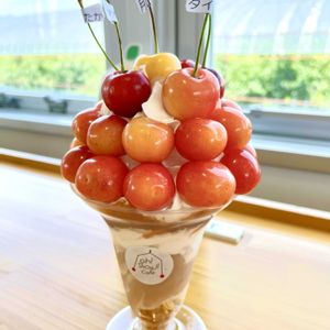 山形県天童市で毎年恒例のパフェ 今月はさくらんぼです 今年はさくらんぼが不作だそうでパックのさくらんぼがお高い… このパフェは1500円でしたがお得に感じました 品種ごとに違う味わいを楽しめました