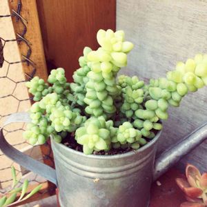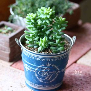おはようございます😊 昨日お花屋さんで一目惚れして 連れて帰りました~🌿 ビアポップちゃん🌵 セリアの缶に穴を開け植えてみました✨