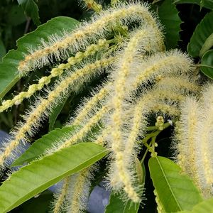 今日のお花 クリ🌰 丸いイガ栗🌰ですが花は長い紐状でふわふわしています。 ①咲き始めの様子(今年5月31日) ②白くブラシの様に咲いているのは雄しべ(2025年6月11日) ③穂の根元でイガイガした形をしているのが雌花からの栗の赤ちゃん。(2024年6月26日 )