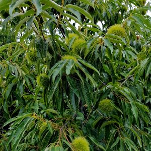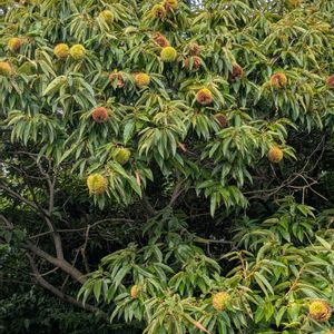 1枚目は晩生品種、まだまだ青い。 9月に入ってようやく雨が降り出したので良くなるかも知れないが、、、間に合わなかったかな😭 2枚目は中生の品種、今1番ボタボタしてる最中です。 せっせと穴を掘ってイガの廃棄。