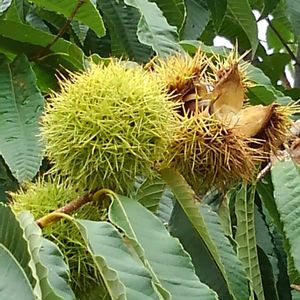 秋の味覚 栗🌰の実が一部茶色くなり弾けて中身が見えている物もありました。 2枚目は、8月8日に撮った写真で実の色は緑です。