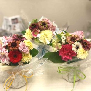バレエの発表会のスタンディングブーケです。 水やゼリーが入った容器なので、そのまま飾れます。 大人の方に差し上げるとのことで、秋らしい色も入れて、3つそれぞれ僅かですが変化をつけています。 ピッタリサイズの紙袋に入れて、そのままお渡しして頂けるようにお作りしました。 オーダー誠にありがとうございました m(_ _)m