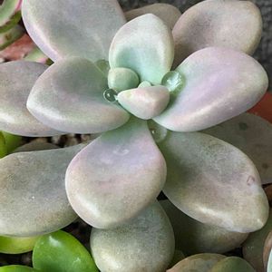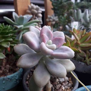 ほんのりピンクでまるまるの グラプトペタルム・だるま秋麗(秀麗)さん😻💗🤍 先日の大雨で 大きな葉っぱちゃんが落ちて ちびっこ軍団になっちゃいました😸💧