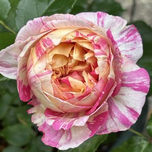 モーリス•ユトリロ 今回は黄色があらわれず しぼりの色合いがそのつど違うのはなぜなのでしょう🤔 ↓デルバールHPより 真紅に黄色と白の絞りの鮮やかなコントラストには誰もが目を奪われる フリル状の花弁が印象的で花もちも良く香りも良い 四季咲き性も強く繰り返しよく咲く 耐病性が強く樹は非常に強健な木立性 名は画家ユトリロにちなむ