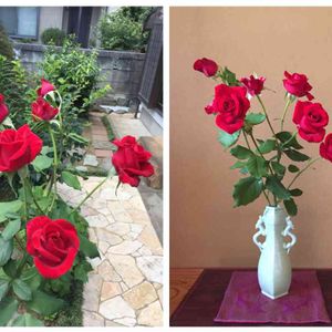 梅雨入り前の薔薇🌹切って床の間に飾りました😊 一本ですが綺麗な房になっていました💕