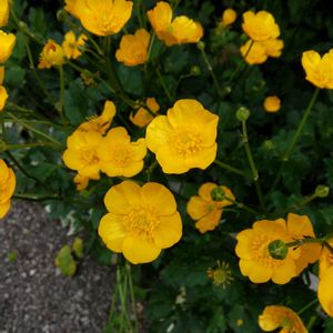 玄関の脇のレンガの小道から 金鳳花ピカピカ✨雑草に埋もれてたのを、せっせと一列に並べて植えて 今は主役級に豪華です🟡