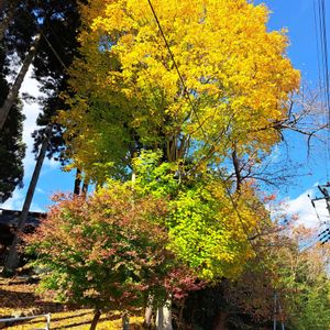 おはようございます☀️😃❗ 昨日の1時過ぎの散歩中の写真です👀📷✨ 寺の前の大きなイチョウの木が綺麗でした~ 3枚目のもみじ🍁は、まだですね。 4枚目は抜けるような青空でした~