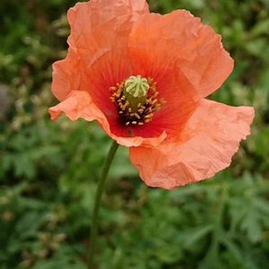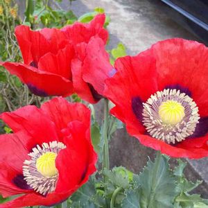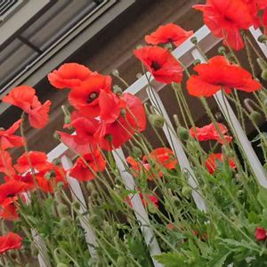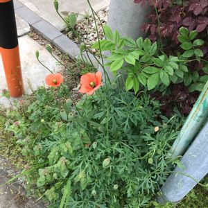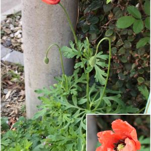 今年も勝手にケシが成長し 花が開き始めました✨ 後ろでは薔薇が成長中🌹