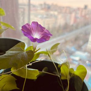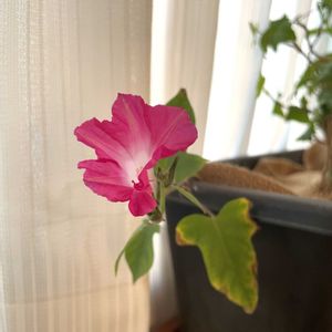 へデラがベランダで寒そうだったのでリビングに入れたら 土の中で眠っていたアサガオが目を覚まし咲きました🌺 かわいい🥰