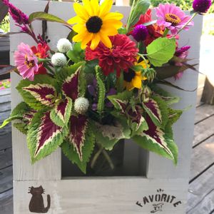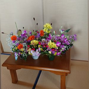 弟の呼び掛けで庭の菊やお花色々でアレンジメントでお花遊びを楽しみました。姉弟4人の作品です🎶 庭の菊が沢山咲いたので と言う弟の提案で楽しい 一時でした🎶