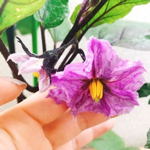 一箇所から2個花が咲いてきた...🤔🍆調べてみると 生育初期になりやすいようです👀💦小さいほうは✂️とります! 一番花もトリました〜 ムラサキがきれい☺️🌸ナスの花は、長花柱花が目安なのですね👍