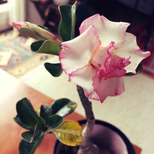 ~アデニウム・砂漠のバラ~ スリヤンチャンター 咲き始めました♥️ まるで造花のような完璧なお花です✨ 今夜は雨風が強いので、お部屋の中にご招待🤗
