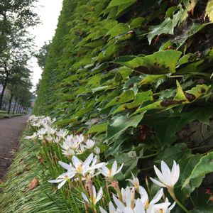 緑の壁とタマスダレ タマスダレが咲きそろうと、もうそろそろ夏も終わりですね
