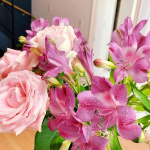 💜紫のアルストロメリア💜⚜✨ ♡花言葉♡ 紫色は … 「 小悪魔的な思い 」 🥀👸♥️ 「紫色のアルストロメリアの花言葉はあまりはっきりとはしていませんが、そのエキゾチックな姿から、この花言葉が使われているとされています。」だそう😌ステキ✨ お隣のピンクの薔薇🌹🎀 ♡花言葉♡ ピンクのバラの花言葉は 「しとやか」「上品」「感銘」だそう💕 可愛い💗