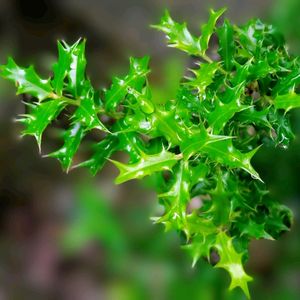 西洋柊(セイヨウヒイラギ) モチノキ科モチノキ属の常緑小高木。成長すると15mほどになることもあるが、通常は森林の下層低木として、あるいは生垣や庭園で見ることのほうが多い。葉の縁に棘状の鋸歯があり、若い木は鋸歯が多いが老木は少ない。春に香りのある小さな白い花が咲く。雌雄異株だが両性花をつける雌株も多い。雌株は11~12月に赤い実をつける。クリスマスホーリーとも呼ばれ、欧米では近縁のアメリカヒイラギとともに聖なる木としてクリスマスの飾りに使われる。イギリスの多くの地域で、西洋柊を切り倒すと不幸がもたらされると信じられている。 出典『樹木の事典600種』『150の樹木百科図鑑』