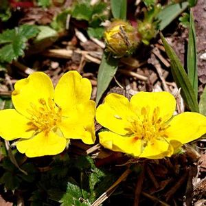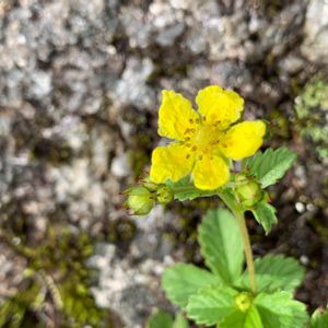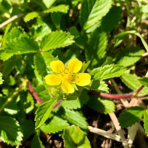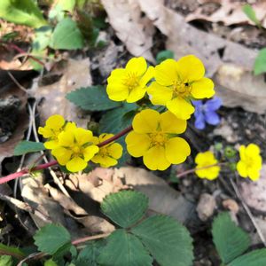 💚💛キジムシロ(雉筵、雉蓆)💚💛 山野草 別名: オオバツチグリ(大葉土栗) 花径は8mmくらいで小さいですが黄色が鮮やかで目立ちます。 つる性の茎をいっぱい地面に伸ばしています。 葉の形は鳥が羽を広げている姿のようで、イチゴの葉に似ています。 バラ科 キジムシロ属の多年草。 名前の由来: 葉や茎が地面に這いつくばりキジの座る筵に見立てたものです。 花期:5〜6月 似ている仲間: ツルキジムシロ、ミツバツチグリ 花言葉: 「明るく輝いて」✨💫🌟