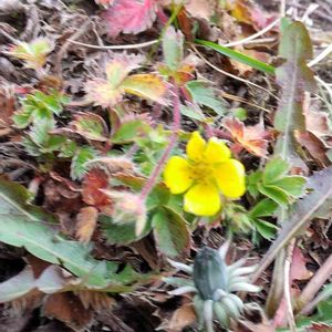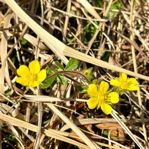 枯れ草の中から顔を出しているのは、キジムシロの三姉妹です。 みんな可愛いね。 ヘビイチゴの仲間でお花もよく似ていますが、残念ながら実はイチゴになりません。
