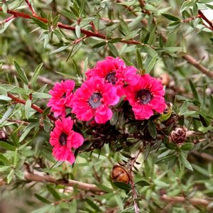 1月26日 今日のお花 ✨🌸ギョリュウバイ🌸✨ ギョリュウバイの別名は、次のようなものがあります。ティーツリー(Tea tree、ネズモドキ(鼠もどき、 マヌカ(Manuka) ギョリュウバイから採取された蜂蜜はマヌカハニーと呼ばれます。このマヌカハニーですが、胃がんなどの疾患とかかわりが深い、ピロリ菌に対する殺菌力があるということで、一躍有名になりました。他にも整腸作用や美肌効果があるとされ、エッセンシャルオイルや化粧品などにも活用されています。 開花期 4〜6月.11〜4月 (早咲きと、遅咲きがある) 2024.3月撮影