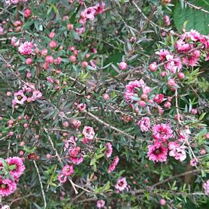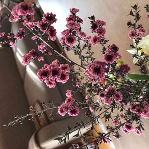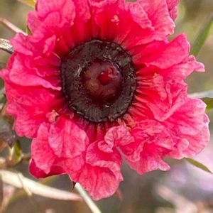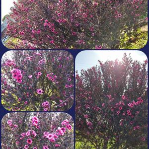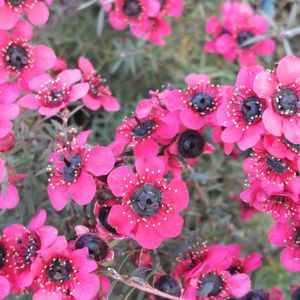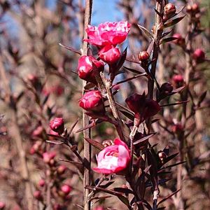 2021,3,1 7:46撮影 ジャノメエリカの近くの低木に赤い花が3輪位さいてる。 オーストラリアではこの花の蜜がマヌカハニーになる。 雌蕊は中心の少し赤くなってる所 雄蕊は赤い花弁に少し黄色いのが見えるのがそうかな。中央の茶色の部分が蜜のように光ってる 味見すればよかった💦