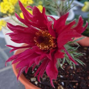キンポウゲ科 おきな草🌸 初めて知ったお花🌸 かごに綺麗に並んでいて、可愛くて.... まだみんな蕾、苗を見ても色がよくわからない😆 お店の方に伺ったら、蕾の真ん中をグイっと指で開き(ちょっとびっくりのやり方)色を確かめてくださったけど、確認できず....。 カゴの中の青と紫の2つをお迎え👍 今日見てみたら開花🤗 なんか真ん中の雄蕊雌蕊の部分からど真ん中にまたお花と同じ色の花びらのような何かが伸びてる。表現が上手く出来なくてごめんなさい🙏 この花ネット情報で開花後の綿毛になる時がかなりユニークで、白く長く伸びることからおじいさんの髪の毛みたいと名付けられたそう。咲き終わってからも長く楽しめそう。
