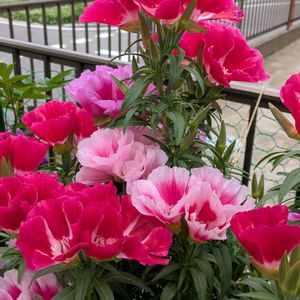 🏷真っ赤な火曜日 参加します ①② ゴテチャ 別名「色待宵草(イロマツヨイグサ)」 ③④ ミニ薔薇 別名「姫バラ」 ⑤ ペチュニア 和名「衝羽根朝顔(ツクバネアサガオ)」 カーポート下にて 25.05.27