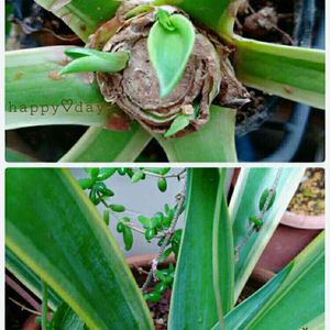 12月初め頃 ベランダ掃除中 鉢を倒し 折れてしまったアガベ… 上半分はそのまま挿してたら 根付いている 根の方はダメかと思ってたら 芽が出てきました!! ♡♡♡がんばってる♡♡♡