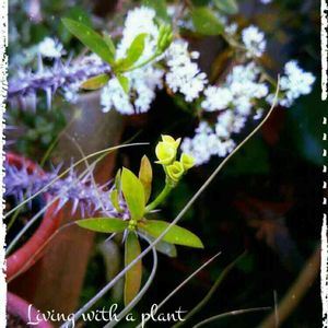 豆蔦葛 1年程前にお招きしましたが スカスカのヘゴに弱々しく へばり付いて水をあげても すぐ乾き徐々に枯れてきたので 土と苔を針金でぐるぐる巻き!! そしたら数日で生き生きし出して…… 小さな蕾♡つけてくれました