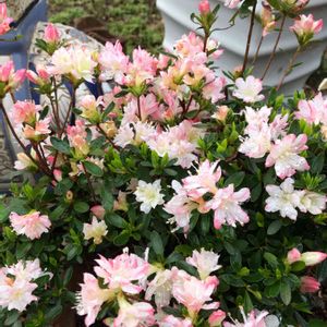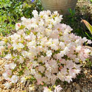 3年目だか4年目だかの"久留米ツツジ・レジナ" 今年も咲き始めたよ🌸✨ ピンクから白の濃淡が可愛いです💗🤍 ビヨーンと2本そびえちゃってるのはご愛嬌🤣