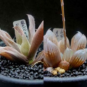 みっちーさんちからお越しの山田ブラックオブツーサ錦(斑無)と風のベルhyb.。 それなりの直射日光が当たる場所でがっつり作ってます( *´艸`) 風のベルhyb.は、我が家の中では1番遅く動き始め、ようやく新葉が次々出てきてる様です。横から子株も出て来て傾き始めました( ̄▽ ̄;) ブラオブさんは特に日当たり良好な場所でカッチリいってます。 花芽出てきたので✂️チョキン お水あげたのでプリプリ。 元気ですよー‼️