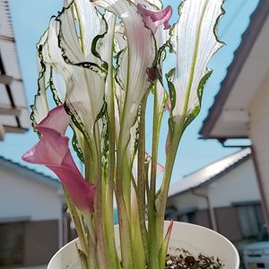 カラー「フローズンクィーン」 冬には上部が枯れて無くなる様なので 今のうちに… 葉のクルリンが強くなって来たかなぁ でも相変わらず綺麗です✨