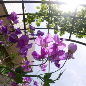 赤でなく紫のスィートピー、アーチに這わせています。 光を透かした花びらがキレイ❤️