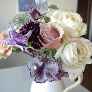 お花屋さんから春を連れてきました。普段はあまり選ばない赤色系のラナンにスィートピー。シックなミルクピッチャーに飾って、お茶をしていたら、荒れてたお天気が回復しました。 良かった🤗 明日も晴れるといいな🌞