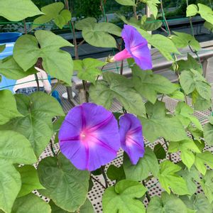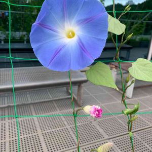 🌼朝顔🌼 グリーンカーテンの方は まだまだ咲かないけど 畑の朝顔は、モリモリ生育中 野菜さんの、邪魔しないでね😅