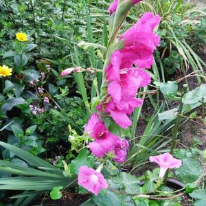 グラジオラスと朝顔 お互い頑張って花を咲かせてます