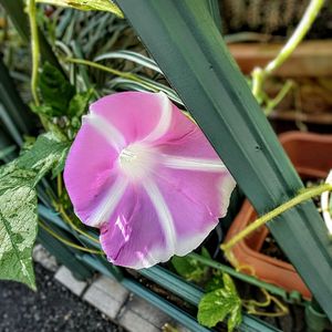 こんな花も咲いています 変化朝顔交配の後代 くすみ色と曜が増えて、花が大きくなる変異を持っているようです。 たぶん、吹詰 だったら種が取れない😭