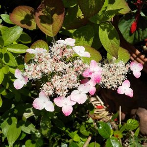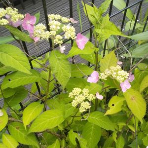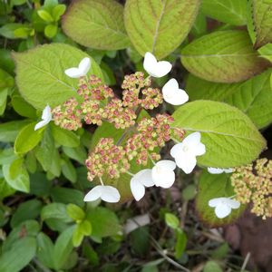 ヤマアジサイ`伊予の薄墨´ 花色が赤く変わってきました。