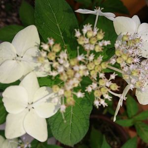 ヤマアジサイの装飾花がすっかり色付き 真花が咲いてきました。