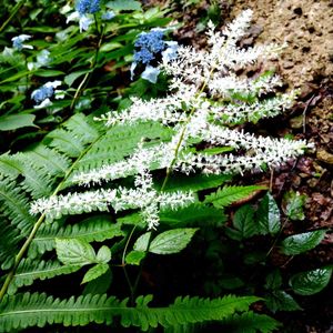 トリアシショウマ ユキノシタ科チダケサシ属 山の斜面を見上げた所に、花穂が枝分かれして白い花が集まって咲いています。 その向こうにはヤマアジサイも見えますね。