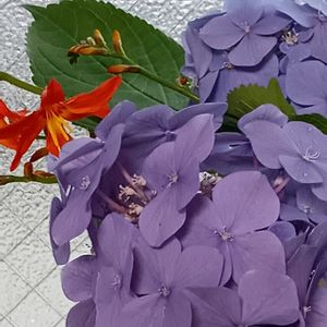 庭のあじさい💙💜🌿 & 庭のヒメヒオウギズイセン🧡🌿 キッチンに飾りました🎶