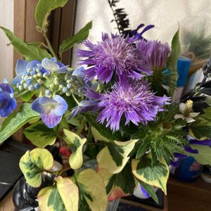 外は カンカン☀️ 真夏日です💦 ストケシアがもう終わるし 小さいあじさいと合わせて 活けてみました☺️