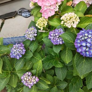 二投目、大変失礼致します🙇♀️ 以前投稿した紫陽花「サマークラッシュ」、「千代女」がますます華やかになってきました🤗 今朝、暑かったけどこの瞬間を残したくて夢中で撮ってました🤣 (サマークラッシュの右上は銀河。左下は衣純千織。開花までもうちょっとかかりそう😌)