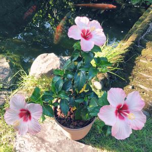 🌺ハイビスカスと鯉🌺 ハイビスカスももう控えの蕾が無いなぁ〜 これが最後かなぁ〜(*´︶`*)