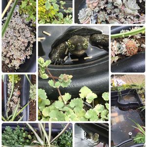 とうとう100pic😊 なかなか無精者のあたくしには長〜いみちのりでした😓 記念すべき100枚目は クサガメ。 昨日、ようやく池に亀を放したのです。 寒い冬ともお別れだ👏 池のまわりの植物たち 折鶴ラン ワイヤープランツ セダム グレゴマバリエガータ スマイラックス 多肉 子持ち蓮華 リシマキア