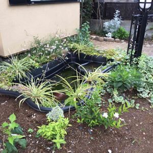 こんばんは😊 今日は昨日に引き続きもう一枚だけ、 「ガーデニング in ラトビア🇱🇻」を投稿させてください❣️ これは我が下宿人さんの弟さんと、彼女さんの二人で作った池エリア。曲線の池も良いですが、こんな感じもモダンで良いですよね😸 周りの植え込みも参考になります〜💕