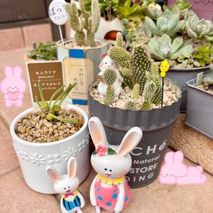 こんにちは♪ 🏷️毎月3日は耳の日 1日遅れ💦 バニーカクタス🐰とモニラニア🐇 🌵🌵 ウサギさんたちは月うさぎの里のお土産☺️ マイメロさんの謎の妖精もどこかにいるよ♡ ちあきさんのださかわ木材缶にも🌵 モニラニアは初めて育てます メセンらしいです☺️ ビョーンとした耳の部分がポロポロ取れるのはなんでだろう? 詳しい方いらっしゃったら教えてくださーい♪