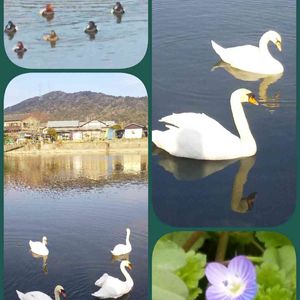 🌱イヌノブグリ 🦢コブハクチョウ 🦆マガモ 久しぶりに白鳥に逢いに行きました。 池に近づくと奥の方にいた白鳥の親子が凄いスピードで来てくれます。 最初ヒナは6羽でしたが今は2羽 親鳥とほぼ同じ大きさになっていました。 持って行ったパンのミミでは足らず、そこら辺のヨモギとタンポポの葉っぱをちぎってあげました。 帰りはみんなで見送ってくれます。 とても帰り辛いくなります!!